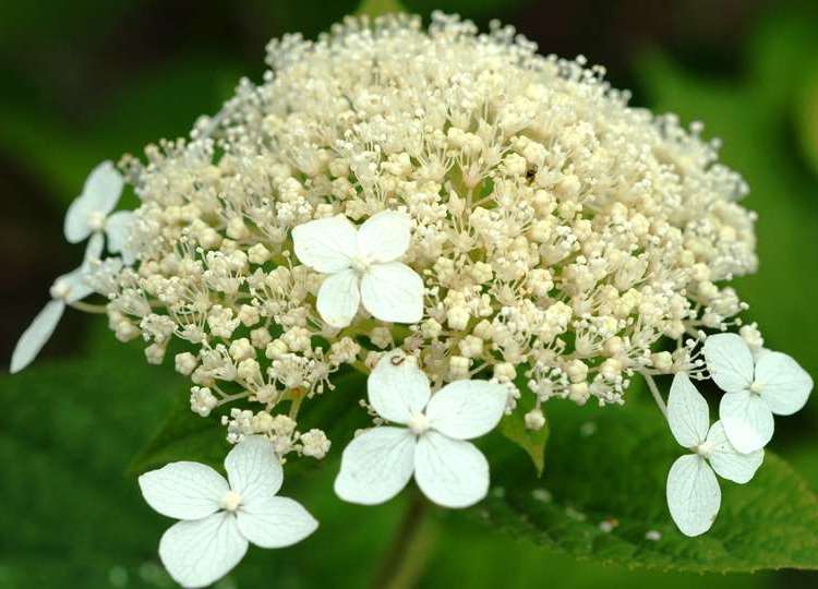 Цветение начинается в конце июня и продолжается до середины сентября. Соцветия крупные, диаметром 15-25 см, имеют купольную форму и напоминают кружевную белую шапочку. В центре соцветия находятся мелкие кремовые цветочки с легким зеленоватым оттенком, окруженные более крупными белыми бесплодными цветами. Цветы источают тонкий, едва уловимый аромат, привлекающий бабочек. Плоды появляются в октябре и представляют собой маленькие коробочки размером 2-4 мм. PH почвы не влияет на цвет соцветий.