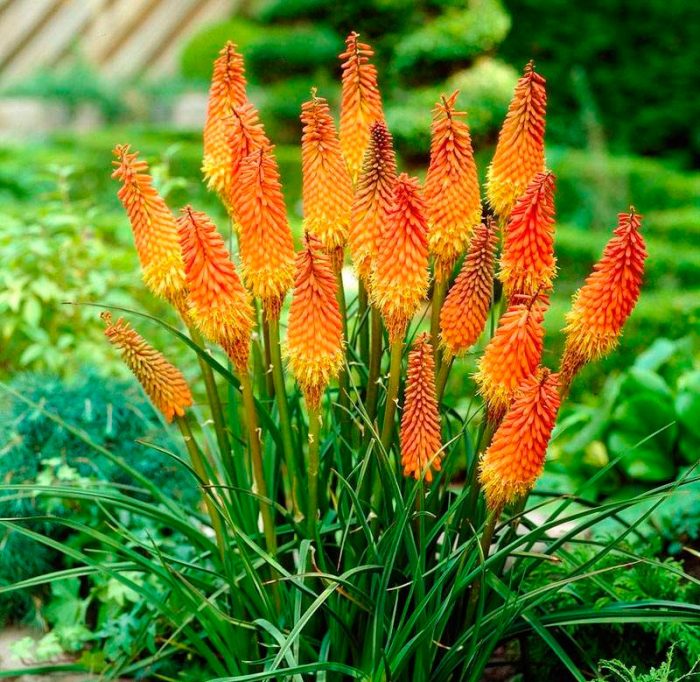 Цветение Книфофии – это настоящее зрелище. Яркие кораллово-красные бутоны и желто-оранжевые цветы распускаются в июле и продолжают украшать сад на протяжении двух месяцев.