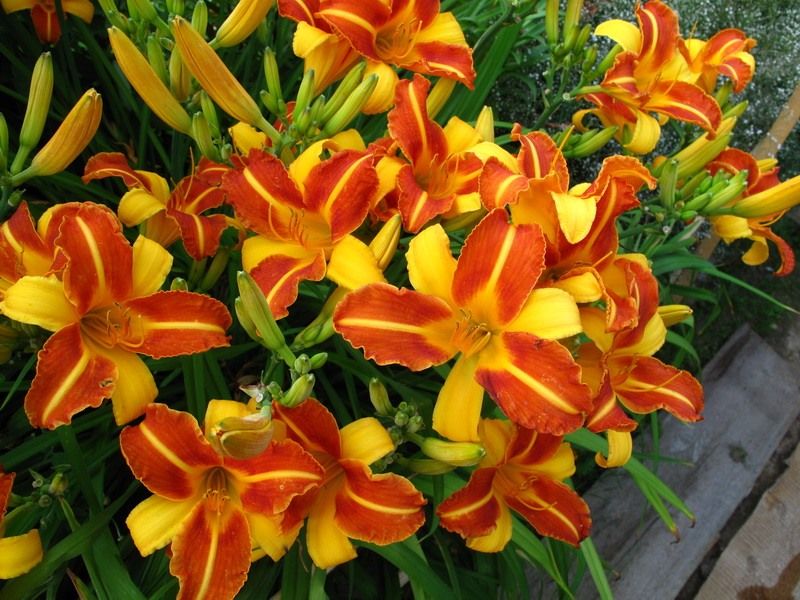 Описание: Лилейники – это многолетние травянистые растения с корневищами и мясистыми корнями. Их мечевидные, изогнутые листья формируют плотные кусты. Цветки, напоминающие лилии, крупные, чаще всего воронковидные, шестираздельные, с небольшой трубкой, собраны в соцветия по 2-10 штук. Каждый цветок живет всего один день, но благодаря множеству бутонов на взрослом растении, цветение продолжается долго. В прохладную и пасмурную погоду цветки могут сохраняться до шести дней. Общая продолжительность цветения куста составляет 25 и более дней. Лилейники – одни из самых неприхотливых многолетников. Они зимостойки, засухоустойчивы и жизнестойки. Сохраняют декоративность с весны до поздней осени. На зиму их можно не обрезать, достаточно подсыпать к кустам торфокомпост. На одном месте могут расти очень долго, образуя крупные, широкие кусты.