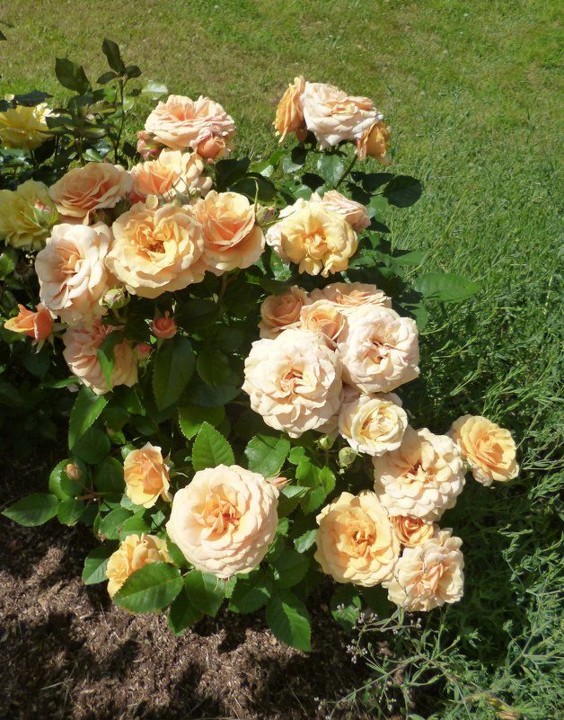 Описание: Этот сорт розы отличается мелкими абрикосовыми цветками с розовым оттенком на краях лепестков. Цветки средне-махровые, состоящие из 26-40 лепестков. Листва ярко-зеленая, полу-матовая, что придает кусту особую декоративность.