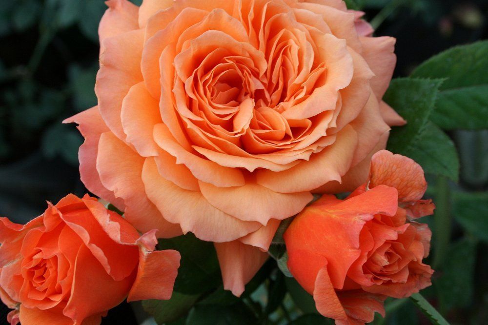 Цветки крупные, густомахровые, диаметром от 8 до 13 см, состоящие из 26-40 волнистых лепестков. По мере распускания форма цветка меняется от округлого бутона до чашевидной. Нераскрывшиеся бутоны имеют оранжевый оттенок, а полностью распустившиеся цветки приобретают оранжево-персиковый цвет. Цветки собраны в небольшие соцветия по 5 бутонов.