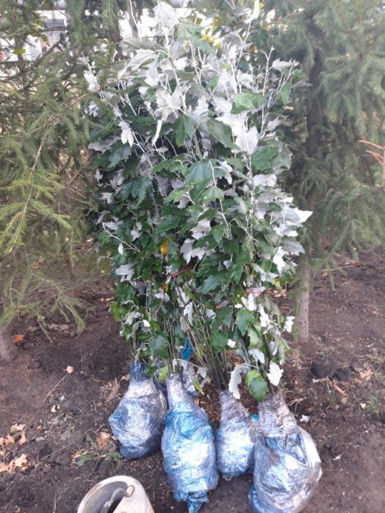 Саженец плотно заворачивается в гофрокартон. Это позволяет избежать появления повреждений ствола и обломанных веток. К высоким саженцам крепится штатив из дерева.